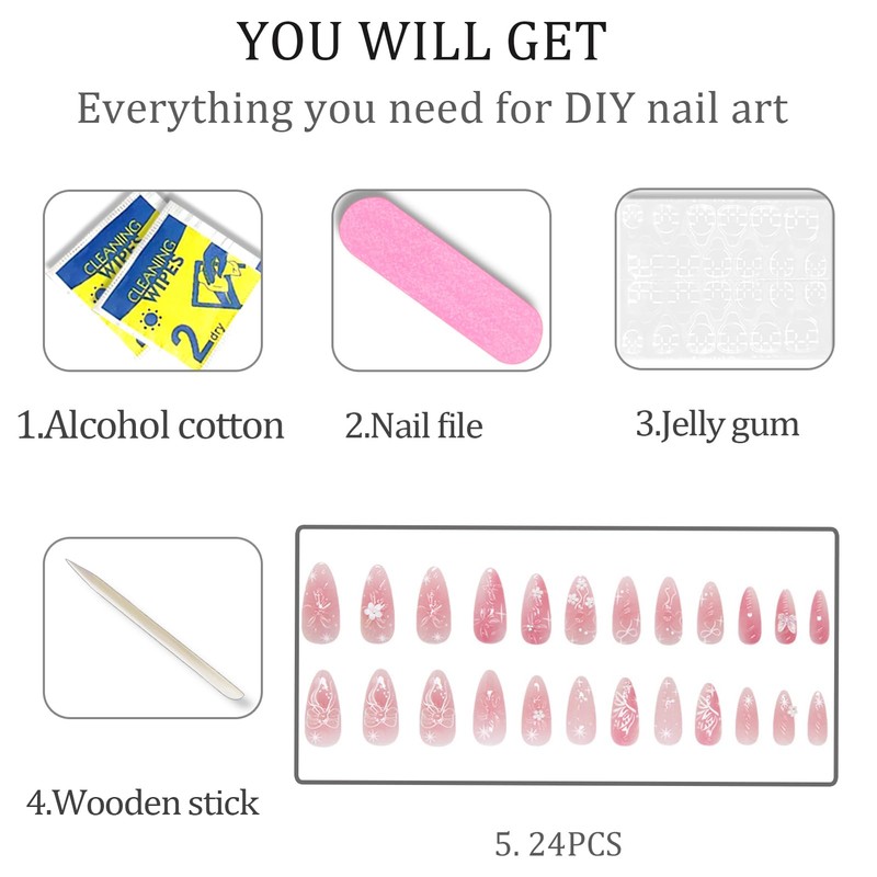 - 【Press Ons Package】- 24 pcs/12 sizes Almond nails, 1 cleaning cloth,1 nail file, 1 stick wooden stamp, 24pcs jelly glue. (Please use Your own nail glue when wearing for 7-14 days).
