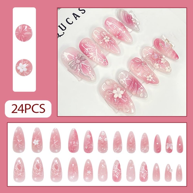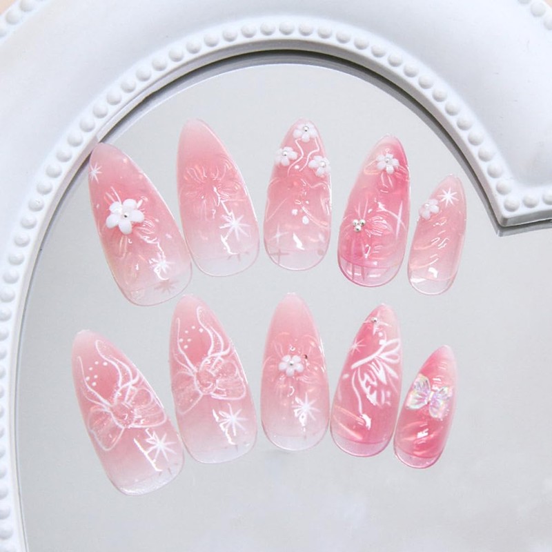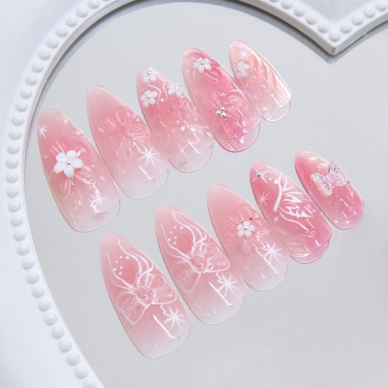 WAFOLOZE Nails Press on, Almond Press on Nails Medium Length Girls Fake Nails with 3D Ice Flower Butterfly Sweeter Design, Artificial False Nails Press Ons Glue on Nails For Women