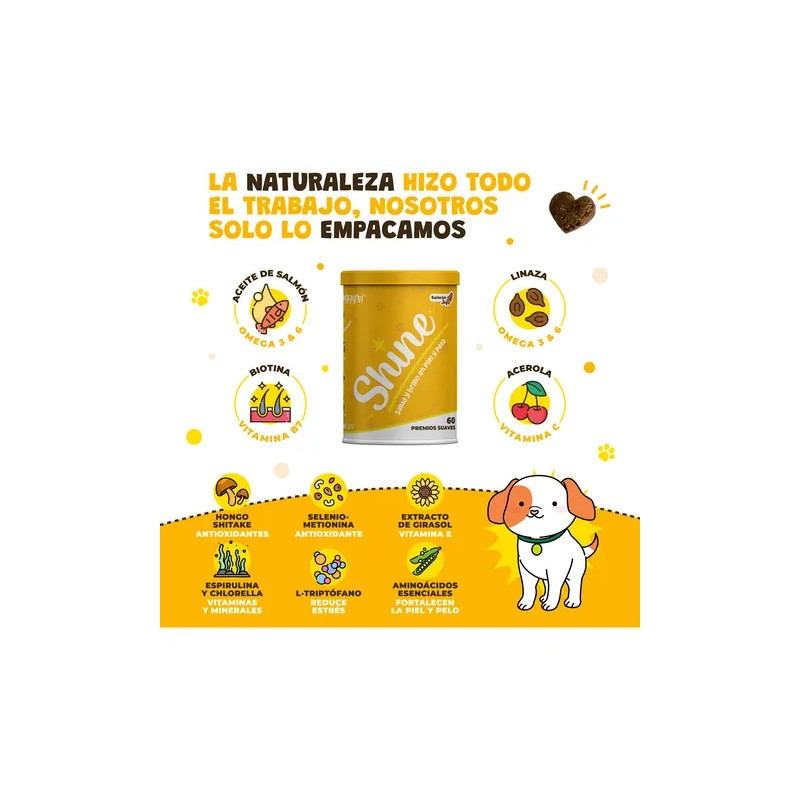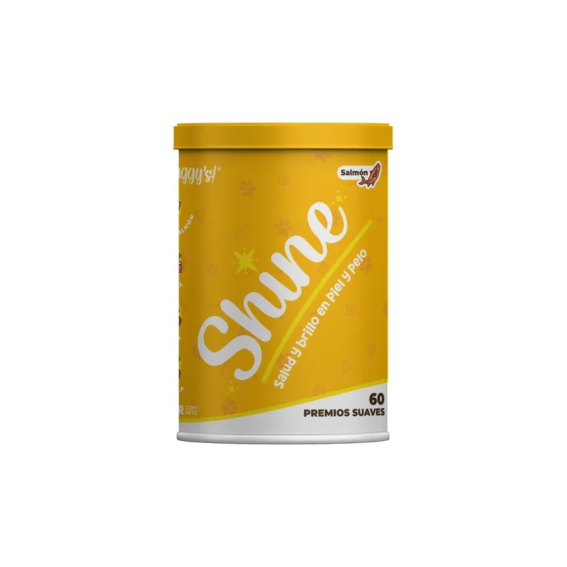 Waggys® Shine es un suplemento natural en forma de premios suaves con delicioso sabor a salmón, formulado para mejorar la salud de la piel y el pelaje de tu perro. Contiene aceite de salmón y linaza, ricos en Omega-3 y 6, que nutren profundamente, reducen la resequedad y fortalecen el pelaje. Enriquecido con acerola (fuente natural de vitamina C) y biotina para estimular el colágeno, aliviar irritaciones y fortalecer los folículos. Ideal para todas las razas y libre de gluten. Presentación de 60 piezas (120 g).