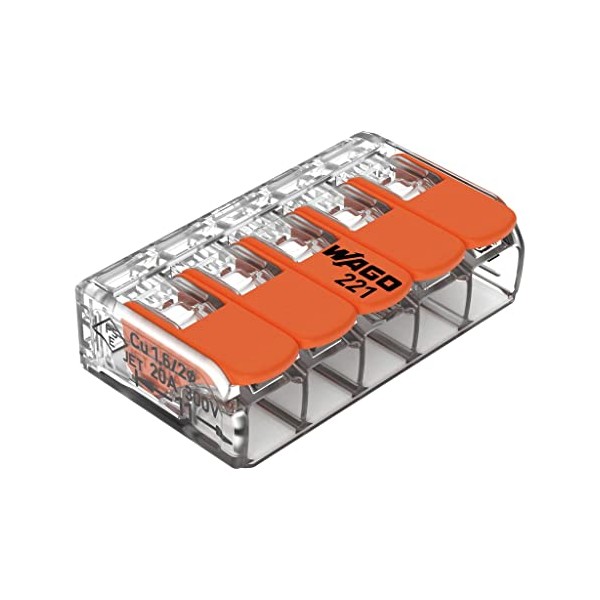- Product features: Series 221 connection terminals for all types of conductors. Now even smaller and more handy. Rated current: 32 annual voltage: 450 V. Colour: transparent. Number of terminal points: 5 suitable for solid conductors. Conductor cross section flexible (fine-wire) with wire end ferrule: 0 14 - 4 0 mm². Nominal cross section from/to: 0 2 - 4 0 0 mm². mm²Suitable for Multi-wire conductorsSuitable for flexible conductorsWith actuation leversProduct typeConnection terminalColor transparentNumber of terminal points5Quantity [pcs]25