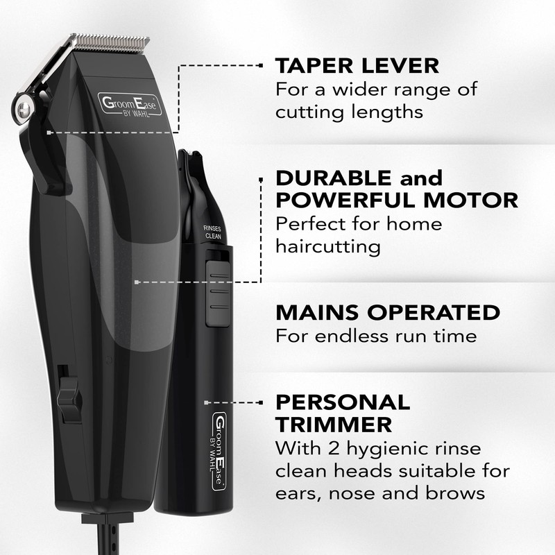 - BATTERY POWERED TRIMMER - The clipper comes with lightweight battery powered trimmer with 2 hygienic rinse clean heads. The detail head is for trimming the ears, eyebrows, sideburns and for detail work. The rotary head removes unwanted ear and nose hair and with a hygienic rinse clean blade