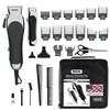 The Wahl Deluxe Chrome Pro 25-piece complete haircut kit has all the tools you need to make haircutting at home easier than ever. Perfect for total body grooming, this haircut kit is used by a wide variety of people for their haircutting needs, including professional cyclists, swimmers, and other athletes to trim body hair. Our ultra-power heavy duty hair trimming system easily cuts the thickest hair with 35 percent more power than standard Wahl electromagnetic motor clippers. Wahl’s precision self-sharpening precision blades stay sharp longer and continuously sharpen over time; oil between every few haircuts to increase the longevity of your electric clipper motor & blades. With the adjustable taper lever, easily change the closeness of your cut between guide comb lengths, move the lever up for the closest cut & move it down for a longer cut; allows for easy transitioning of blending & fading. Chrome Pro comes with a full-size hair clipper for men with a variety of cutting lengths with a precision t blade and a matching chrome trimmer that helps clean up around the neckline, sideburns, and the ears. This 25 Piece Men's Grooming Kit – Includes the clipper, battery mini trimmer (AA required, not included), 14 attachment combs from 1/16” to 1”, blade oil, soft storage case, trimmer blade guard, cleaning brush, barber and styling comb, scissors, eyebrow trim guide, ear trim guide, and English & Spanish instructions/styling guide. Product in packaging may not be exactly the same as photo due to continuous improvements to the product. The power cord is for use in US outlets only. Note: Made in the USA of domestic and imported parts. Trimmer made in Vietnam. We test our clippers for cutting performance prior to packaging with a hygienic fiber. We do our best to clean the product to remove any testing particles, but it is possible a few may remain. They are not hair and can be simply wiped off.