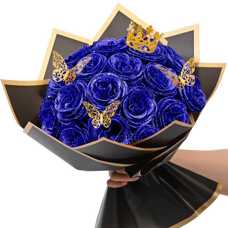 - 💙BRING THE JOY OF DIY:Ignite your creative spark with our DIY glitter roses bouquet — a crafting delight that includes 24 blue glitter roses, stems, ribbons, wrapping papers, crown, and 6 butterflies. Assemble a masterpiece that blooms with your hands, capturing handcrafted allure that you can share with your loved ones.