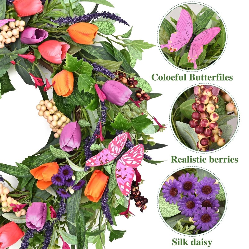 - CAPTURING SPRING IN EVERY DETAIL:Our Spring Wreath Collection overflows with the season's diversity. From multicolored tulips to delicate eucalyptus leaves, fluttering butterflies to lilac tassels, every inch of our Spring Wreath is a homage to the season. Revel in layered textures and vibrant hues as you bring the essence of a blooming spring right to your doorstep.