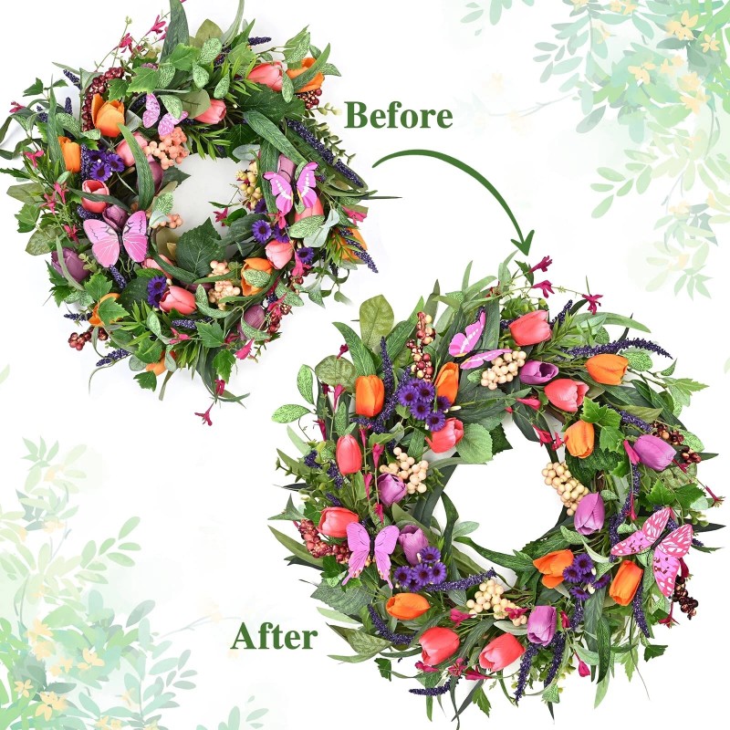 - EASY MAINTENANCE:Our artificial wreaths are designed for effortless upkeep. A quick dust-off is all it takes to keep them fresh season after season, offering you durability and convenience as perennial as spring's own appeal.Enhance your wreath with our easy-to-attach butterflies using the included adhesive dots for a personalized spring flourish.