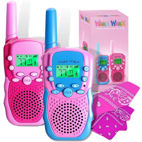 Waka Waka Walkie Talkies for Kids (2 Pack, Pink and Light Blue) — Long Range Two-Way Walkie Talkie Set with Bandanas and Whistles Included — Great for Indoor or Outdoor Play — Gift for Boys and Girls
