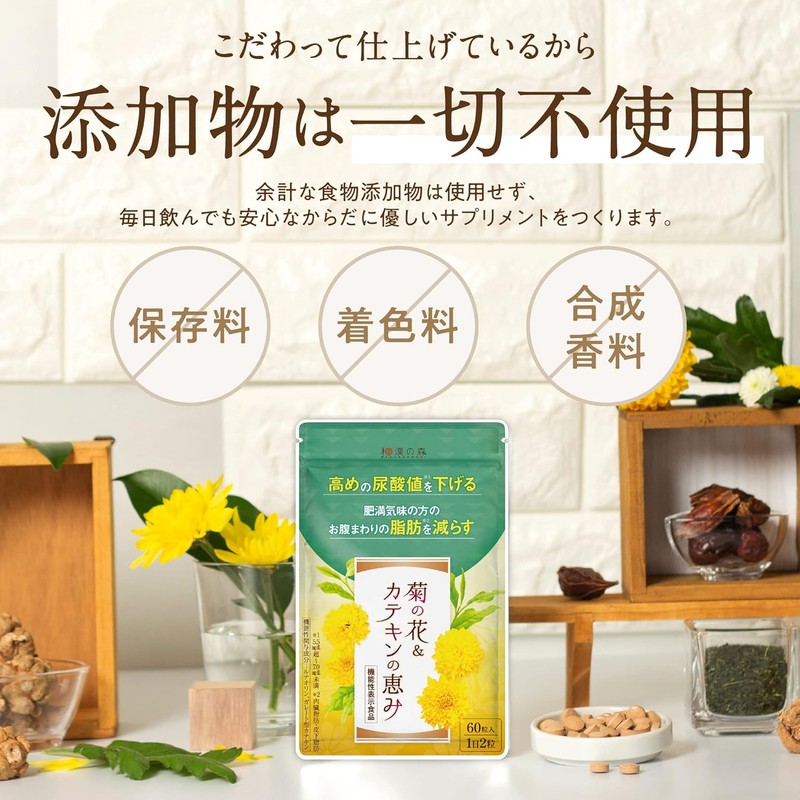 Wakan no Mori Chrysanthemum Flower & Catechin Blessings, Lowers Uric Acid Levels, 60 Tablets, Functional Food, Luteolin, Loses Fat, Visceral Fat, Subcutaneous Fat [Manufacturer's Catalog Included] (1 Bag)