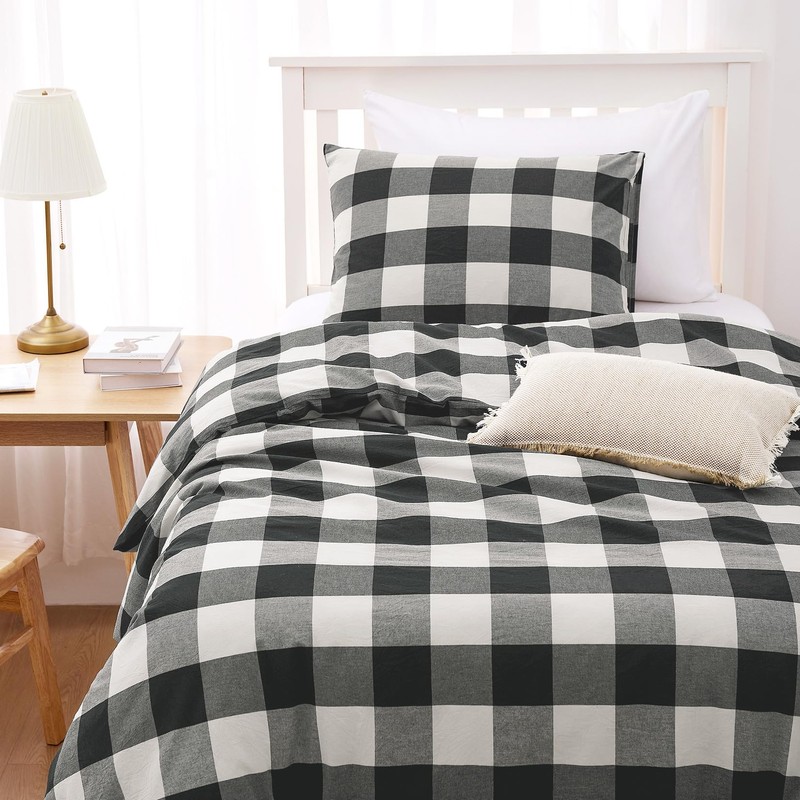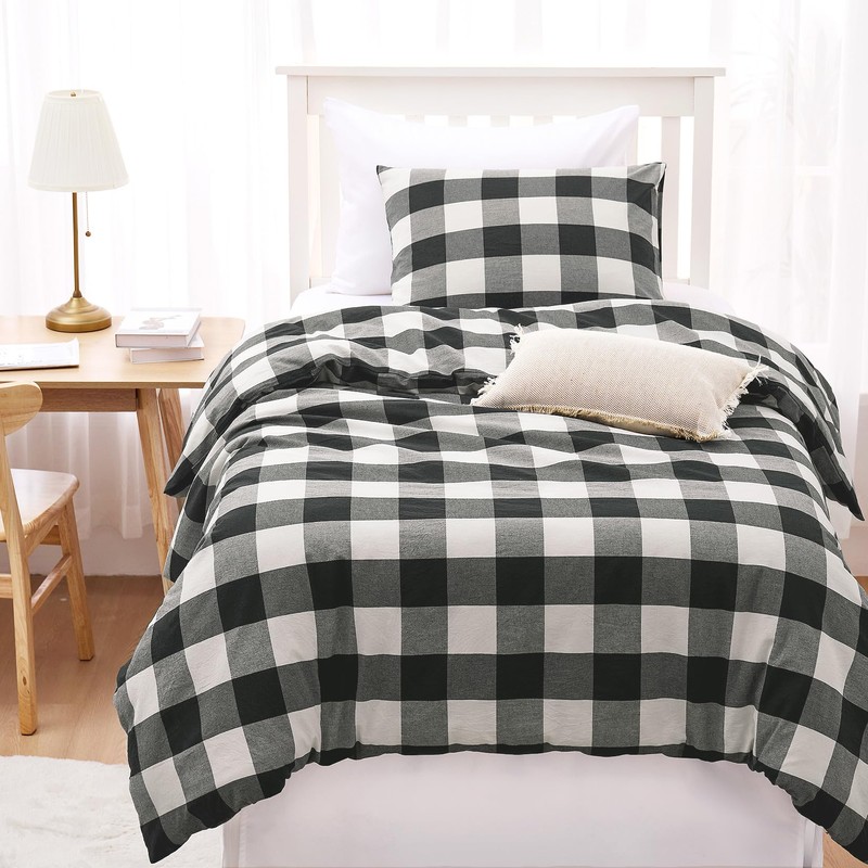 Wake In Cloud - Gingham Cotton Duvet Cover Set, Plaid Buffalo Check Checkered Farmhouse, 100% Washed Cotton Textured Percale Bedding Set, 3 Pieces, Green White, Twin/Twin XL Size