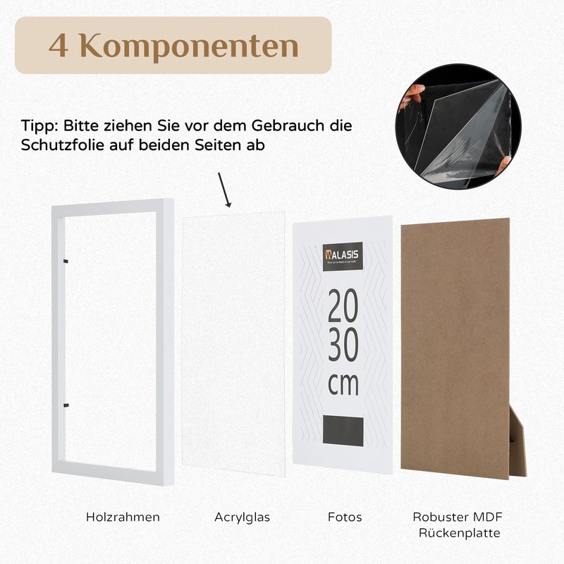 - Picture frame set – the window panes are made of acrylic glass, which does not break even in the event of a fall and is therefore safe for use in the children's room. The acrylic glass is equipped with a protective film on both sides, which must be removed before use.