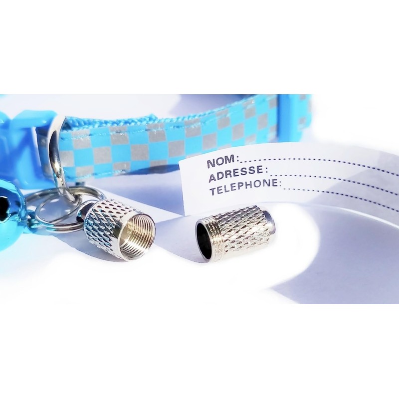 - The Waldoly Serenity cat collar in checked design offers this peace. Thanks to the powerful reflective strip, your cat is visible at night and also audible thanks to the bell. All this keeps him out of danger. With a small pocket, you can write your contact details to identify your cat if it has been lost. This makes this cat accessory a real anti-tear collar. And that is safe for your cat thanks to its anti-choke function.