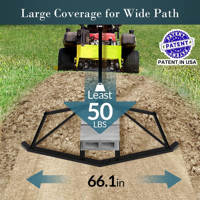 • Effective Leveling Effect: This driveway drag has a width of 66 inches, which is wide enough to cover large swaths of land, so you can get the job done quicker and more efficiently. The center bar construction can be placed with bricks and hold extra weight for deeper dragging, which you can adjust different numbers of bricks for different effects depending on your needs.