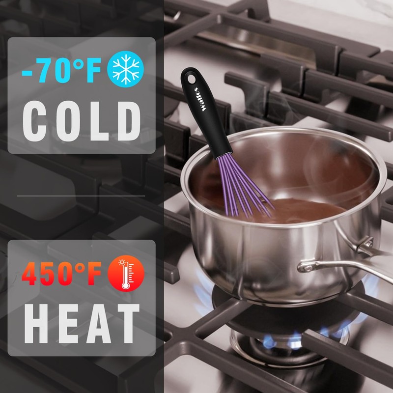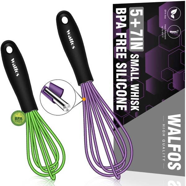 Walfos Whisk,5+7Inch Mini Whisk,Silicone Whisk Non Scratch Whisk,Heat Resistant(480°F) Small Whisk Suitable for stirring individual eggs and mixing small amounts of powder and sauce. (Purple & Green).