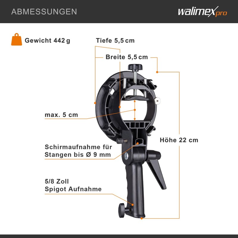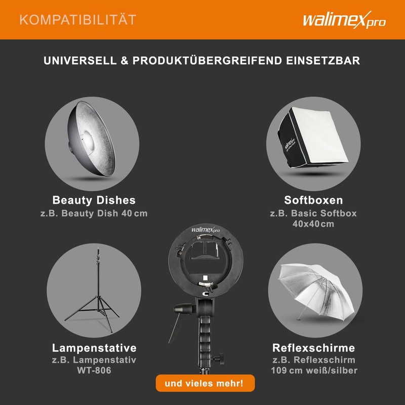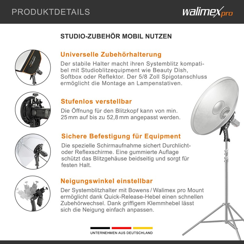 • Box contents: 1x Walimex pro universal system flash holder with Walimex pro / Bowens mount and quick-release lever
