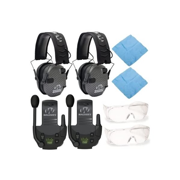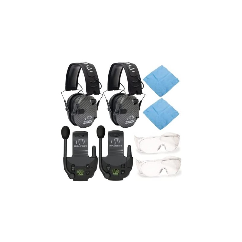 - Bundle Includes: 2 x Walkers Razor Slim Electronic Muff (Carbon), 2 x Walker's Razor Tactical/Hunting Walkie Talkie Attachment, 2 x Walker’s Full Coverage Sport Shooting Glasses (Clear) and 2 x High-Quality Microfiber Cleaning Cloth