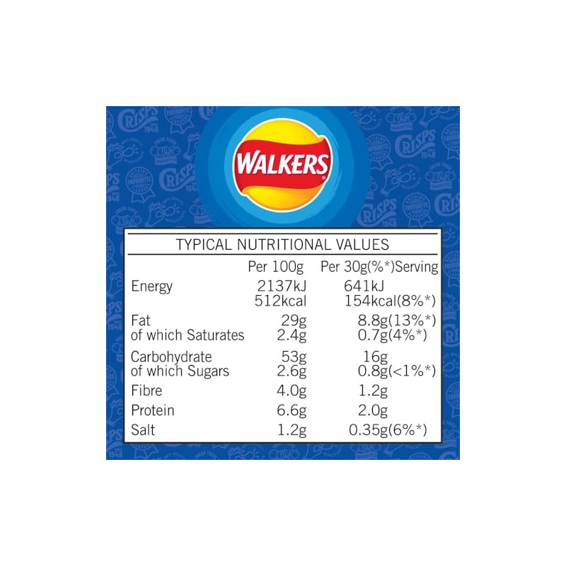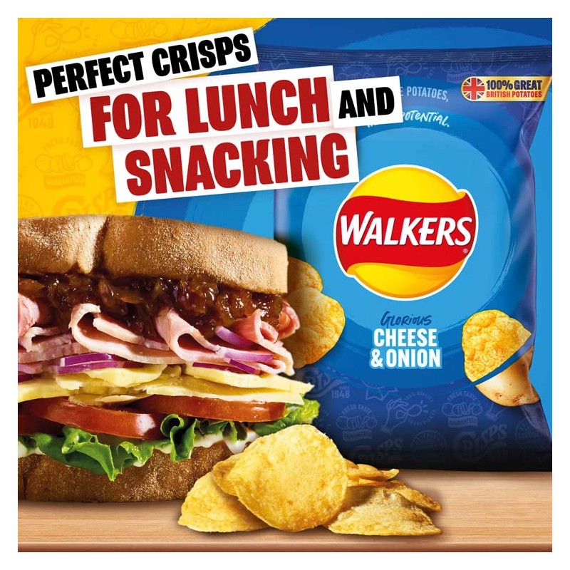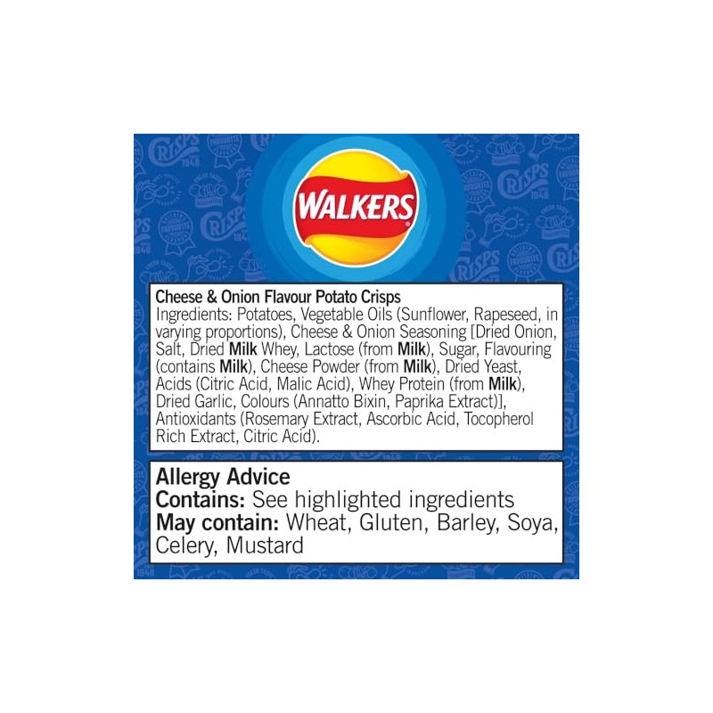 Product DescriptionWhen do you look at a potato, what do you see? Probably just a potato, right? Well, in 1948 Henry Walker saw potential with a bite of positivity he turned his humble spuds into irresistible Walkers Crisps. Since then, our crisps have been providing moments of delicious crunchiness and smiles to everyone in Britain, everyday. So, when life gives you potatoes... Make crisps H. WalkerIngredientsPotatoes, Vegetable Oils (Sunflower, Rapeseed, in varying proportions), Cheese & Onion Seasoning [Dried Onion, Salt, Dried MILK Whey, Lactose (from MILK), Sugar, Flavouring (contains MILK), Cheese Powder (from MILK), Dried Yeast, Dried Garlic, Acids (Citric Acid, Malic Acid), Colours (Annatto Bixin, Paprika Extract)], Antioxidants (Rosemary Extract, Ascorbic Acid, Tocopherol Rich Extract, Citric Acid)Manufacturer Contact InformationWalkers Snack Foods Ltd., PO Box 23, Leicester, LE4 8ZU, UK.