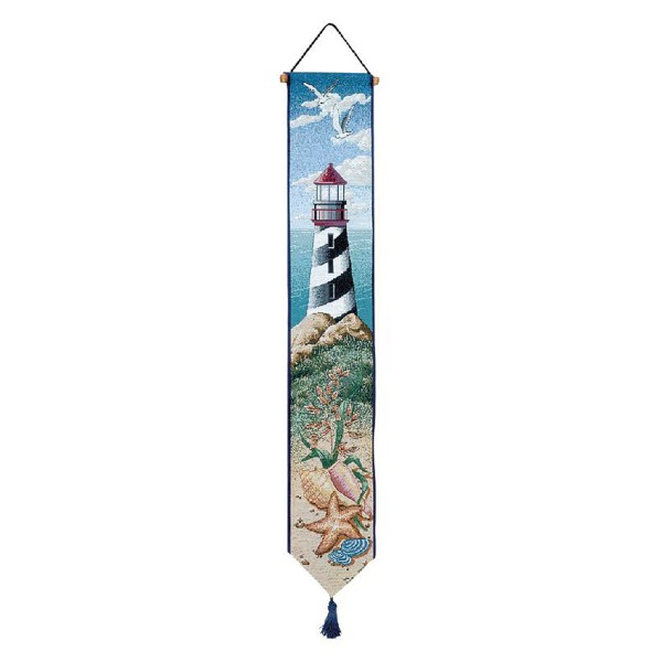 The perfect decorative accent for your coastal retreat, our slender tapestry wall hanging showcasing a bold black & white stripe lighthouse and collection of sea shells looks great hanging between windows or just about anyplace you have a narrow vertical wall space to adorn. Jacquard woven cotton/polyester blend wall hanging. Made in the USA. The wall hanging measures approximately 41"H x 6.75"W. Includes wooden dowel rod and attached cord for easy hanging.