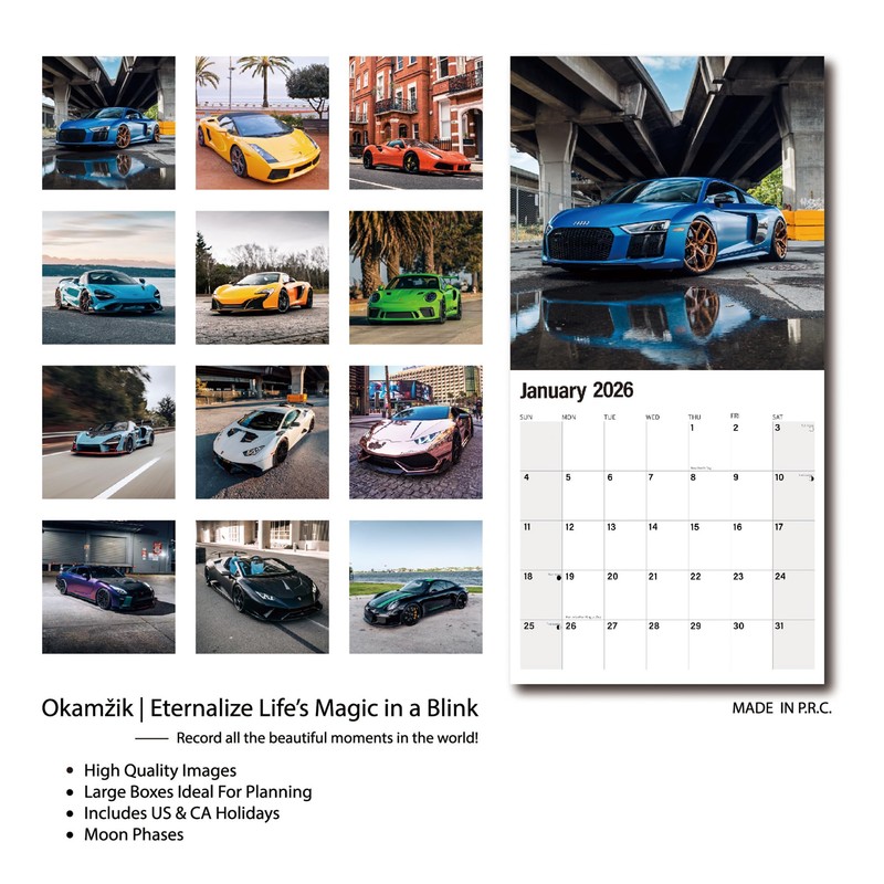 Wall Calendar 2026 Planner Calendar - Dream car Hangable Monthly Wall Calendar with Large Blocks for Organizing & Planning, Academic Schedule, Home, Office & family, Thick & Sturdy Paper (12"x24" Open)