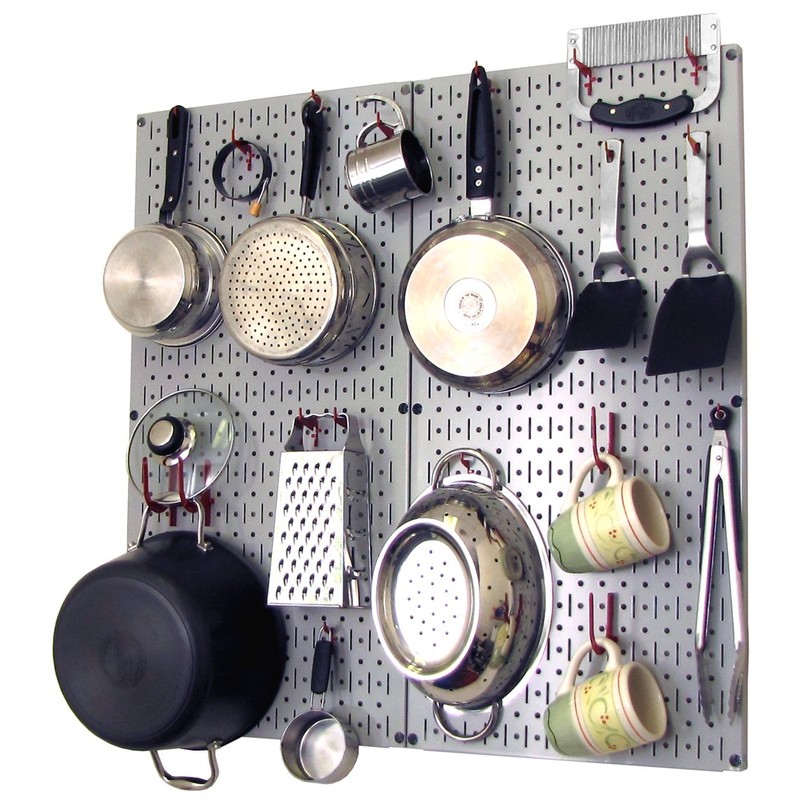 Wall Control Kitchen Pegboard Organizer Pots and Pans Pegboard Pack Storage and Organization Kit with Grey Pegboard and Red Accessories
