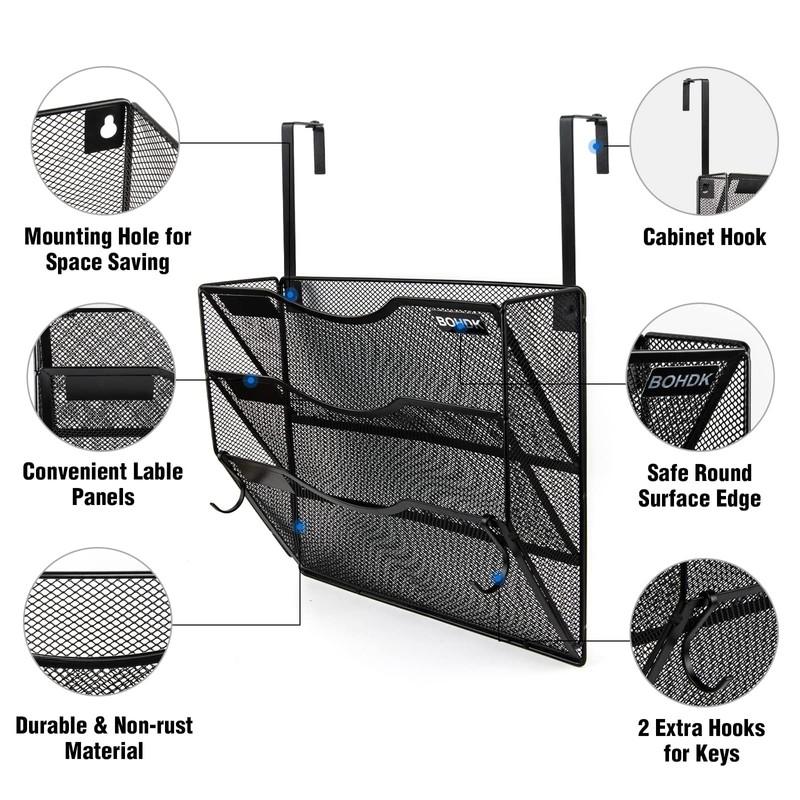 Wall File Organizer, 3 Tire Hanging File Folder Mail Organizer, Vertical Mesh Metal Door/Wall Mount Hanging File Holder, Paper Document Magazine Rack with Hooks for Home Office Black