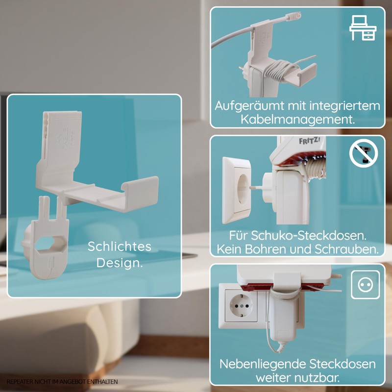 Bring your FRITZ!Repeater 3000AX or 6000 optimally in position - without drilling or screwing. This specially developed socket holder allows easy and stable attachment directly into the socket. Simply plug in the repeater and holder and immediately benefit from better Wi-Fi coverage.