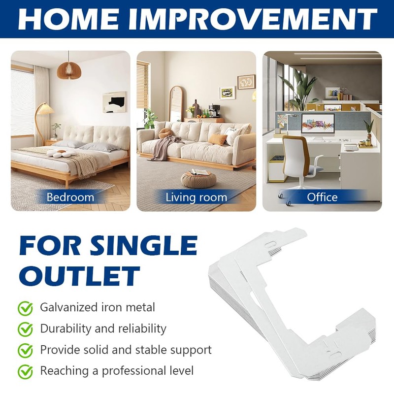 【FOR SINGLE OUTLET】Designed to fit any standard single outlet device, providing precise compatibility for various outlet fastening needs. Suitable for all home improvement projects, our metal outlet shims meet the fixing requirements of most wall outlets.
