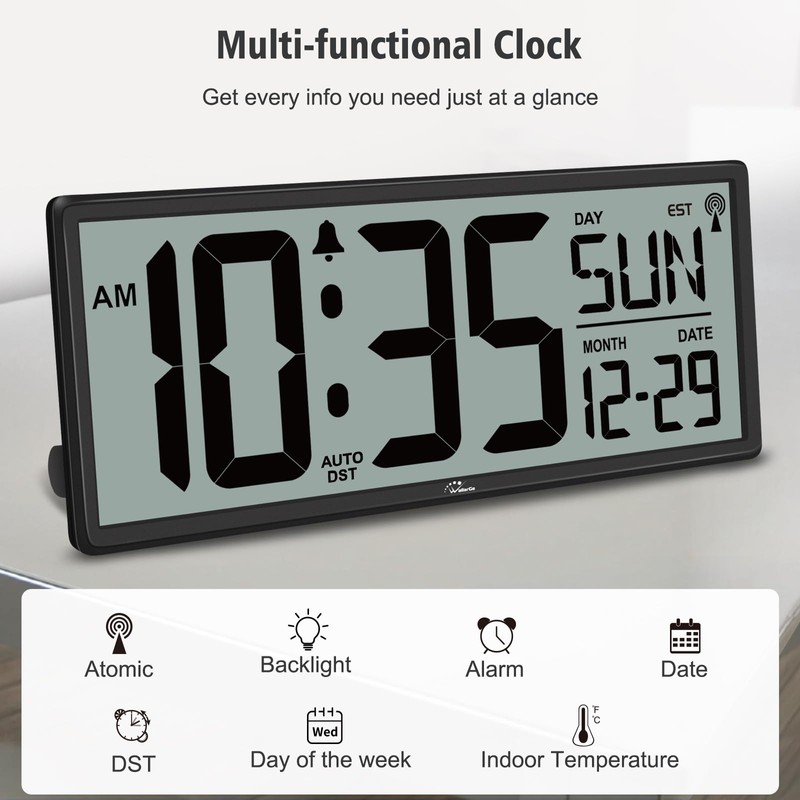 WallarGe 14.5'' Atomic Clock with Backlight, Large Digital Wall Clock Battery Operated, Large Display with Temperature and Date, Easy to Read and Set Digital Wall Clock, Auto DST