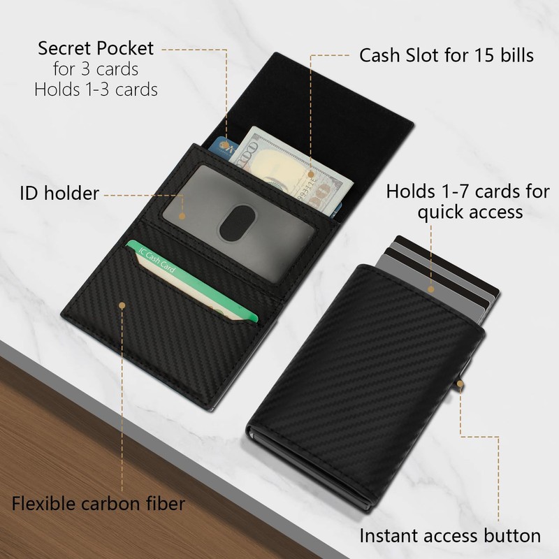 - Quick & Easy Card Access: Wallet For Men Features a Unique Side Button lets Easily Pop Up your Cards in an Organized Order. Design Ensures that Your Credit Card Holder Is Efficient And Easy To Use. Also Includes Three Extra Card Slots and a Separate Cash Compartment For Bills And Coins, Perfect Minimalist Wallet For Men.