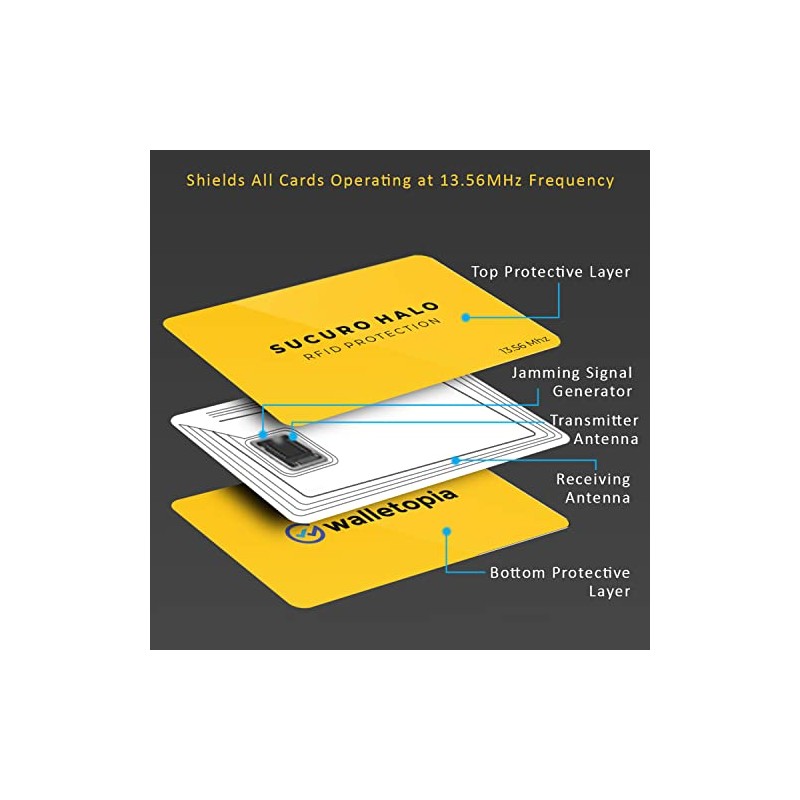 - NO BATTERY REQUIRED - self contained protection, no battery to charge, will never fail against 13.56Mhz signal broadcast