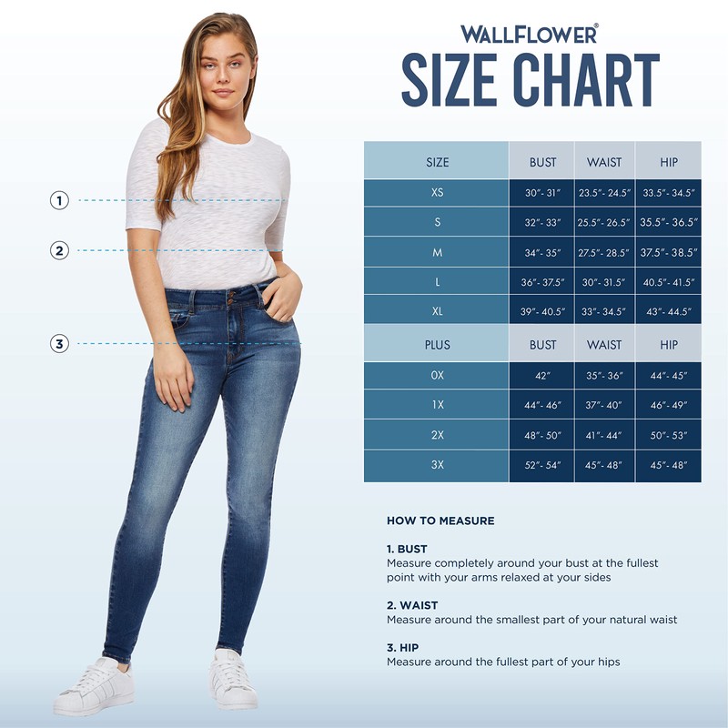 • ECO LOVE: WallFlower’s growing commitment to offer a more sustainable products & cleaner garments for all of us. We are on a journey to craft garments that are more mindful by using cleaner processes, recycled paper tags and more eco materials.