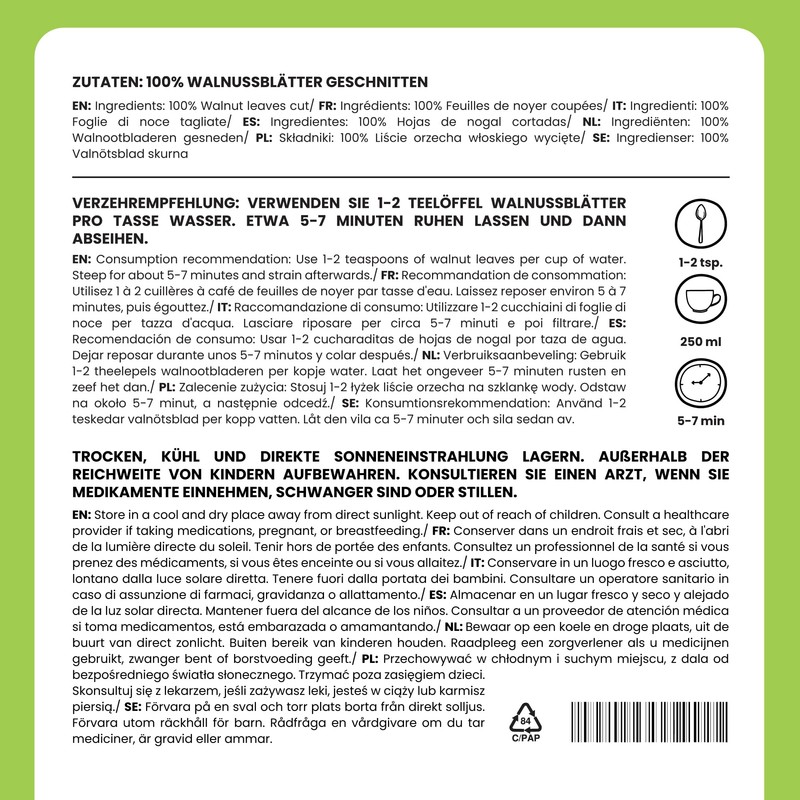 • Geschmackserlebnis: Unser Walnussblättertee hat einen zarten Kräutergeschmack, ideal für die Zubereitung einzigartiger und aromatischer Mischungen in Kombination mit anderen Kräutern wie Minze, Lavendel oder Kamille.