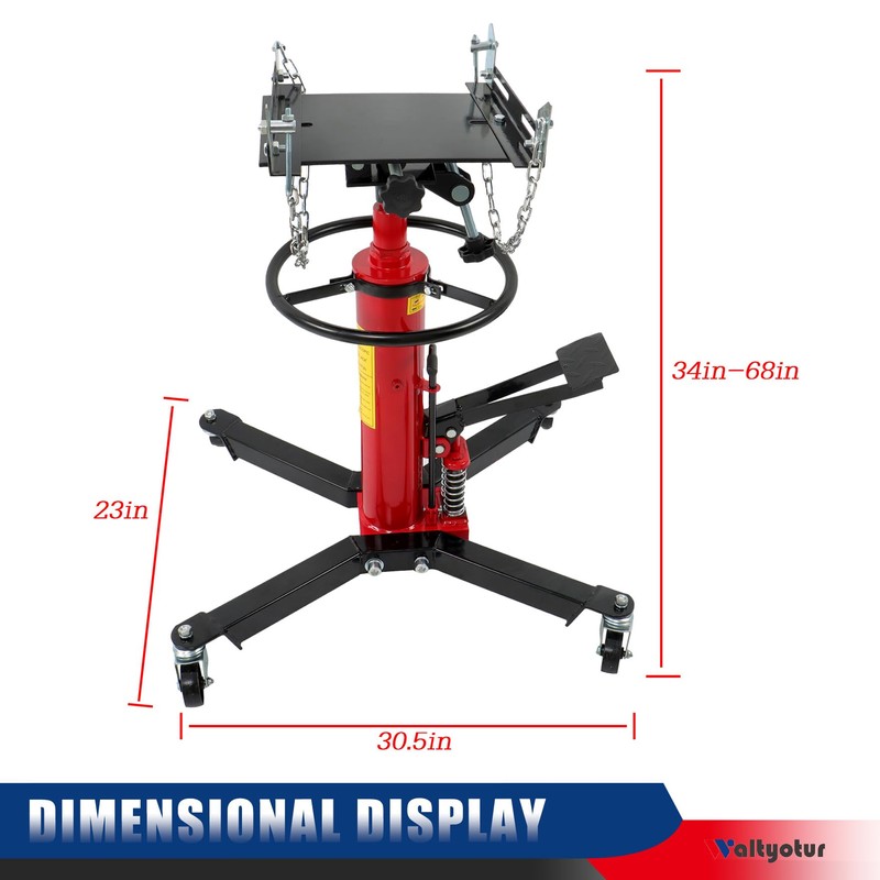 - Adjustable Lift Range: This heavy-duty transmission lift features a hydraulic elevation mechanism with an operational height range of 34-68 inch