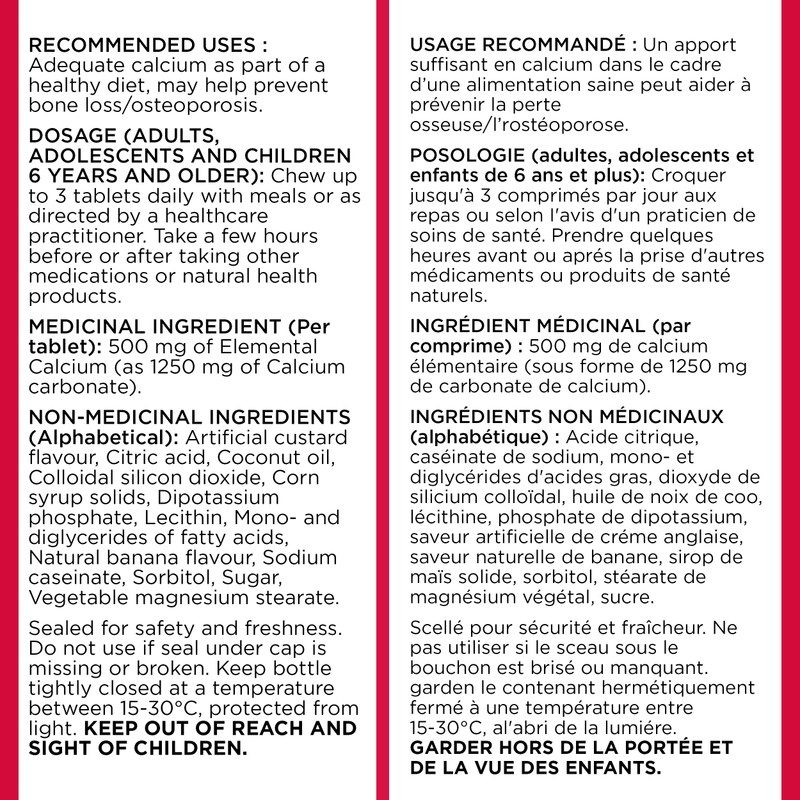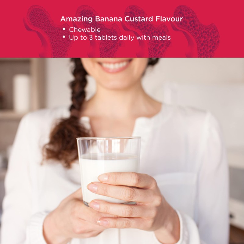 - AMAZING BANANA CUSTARD FLAVOUR: Each chewable tablet contains 500 mg of calcium (as 1250 mg of Calcium carbonate). The chewable tablet is a convenient alternative for adults who do not want to swallow tablets or capsules.