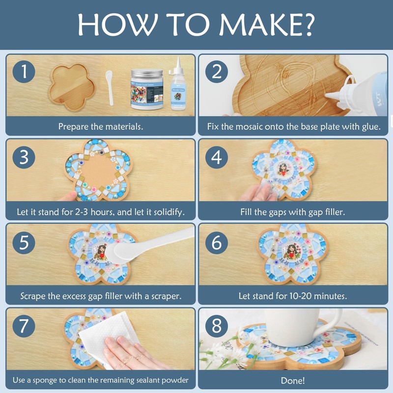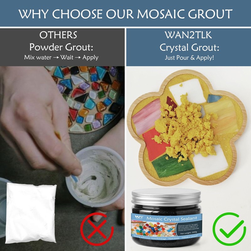 - Easy to Use: The WAN2TLK mosaic glue to fix the glass fragments onto the base plate. Let it stand for 2-3 hours, and let it solidify. Fill the cracks directly with crystal grout and scrape them flat with a scraper. Let stand for 10-20 minutes. Use a sponge to clean the remaining sealant powder. Done!