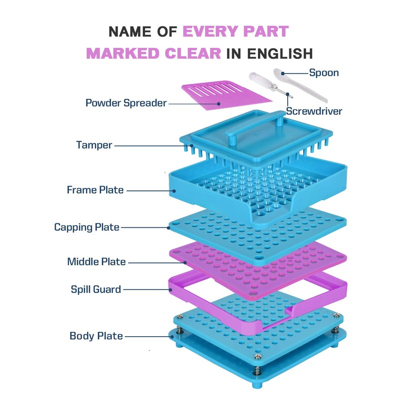 ★ What is a capsule filler – The wananfu capsule filling machine is a well-developed product that makes your capsule filling processes much easier, faster and more practical. Designed for empty gelatin and vegetarian capsules of size 3. ★ IMPROVED DESIGN AND HIGHLIGHTS: 1. Spill Guard This is a circle block to keep the powder in the machine. Powder will not fall on the table. 2. SPOON - Laboratory powder handling spoons come with the machine so no additional material is needed. With its long handle length, it makes it easier for you to transport from container to machine. 3. Frame Plate: Allows you to insert all 100 capsules into the holes in just 10 seconds with the correct position. 4. SATISFACTION GUARANTEE If you are not satisfied with your purchase, please contact us and we will do our best to make it right as soon as possible! ♥ No worry about how to use it anymore – a detailed, clear and colourful instruction manual is included in the pack. There is a video link on this website. So you can fill your own capsules much easier and faster. Specifications: 1. Number of holes: 100 2. Suitable size: 3# capsules ★ Package includes: 1. Tamper, 2. Frame Plate 3. Powder spreader, 4. Cover plate (capping plate), 5. Middle Plate; 6. Capsule body plate (body plate), 7. Spill Guard, 8. Spoon, 9. Screwdriver, 10. Instruction manual