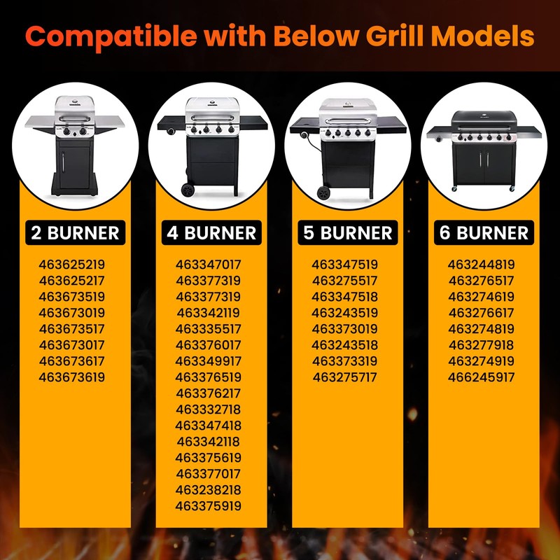 - 【Fits Multiple Charbroil Performance Models】 Compatible with 4-Burner Grills 466347019,466342119,466339417,466335517,463377319,463377217,463377017,463376819,463376619,463376519,463376419,463376319,463376018P2,463376217, 463376117,463376017,463376017P1,463375719,463375619,463361017,463349917,463347418,463347017,463342119,463335519,463335517,463332719,463332718 Note: Not suitable for Charbroil Performance models 463458021,463365021,463351521