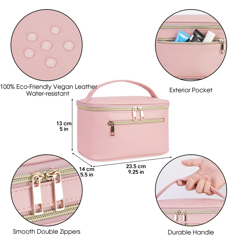 - ECO VEGAN LEATHER This premium cosmetic bag is made of eco friendly vegan leather which is soft, water resistant and comfortable to touch. Its well-padded design provides excellent protection for your makeup and other essentials.