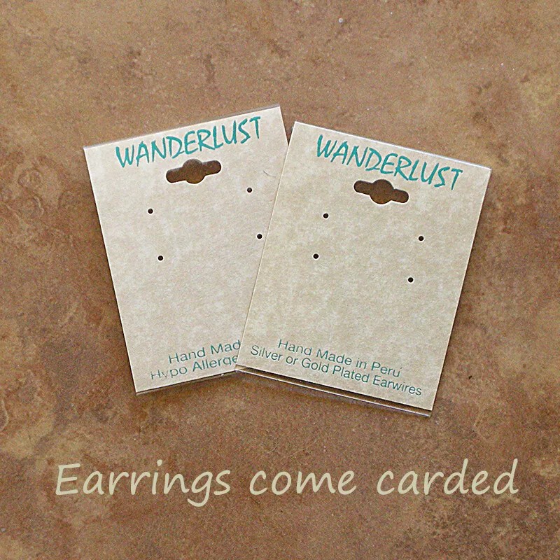 This earrings are painted with tiny brushes made from cat hair. Wanderlust uses non-toxic paints and varnishes. Ear wires, ear nuts and paints are sent to Peru to ensure
