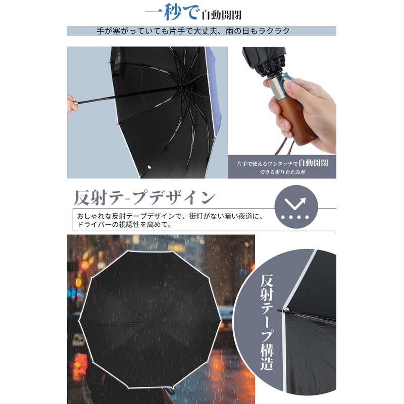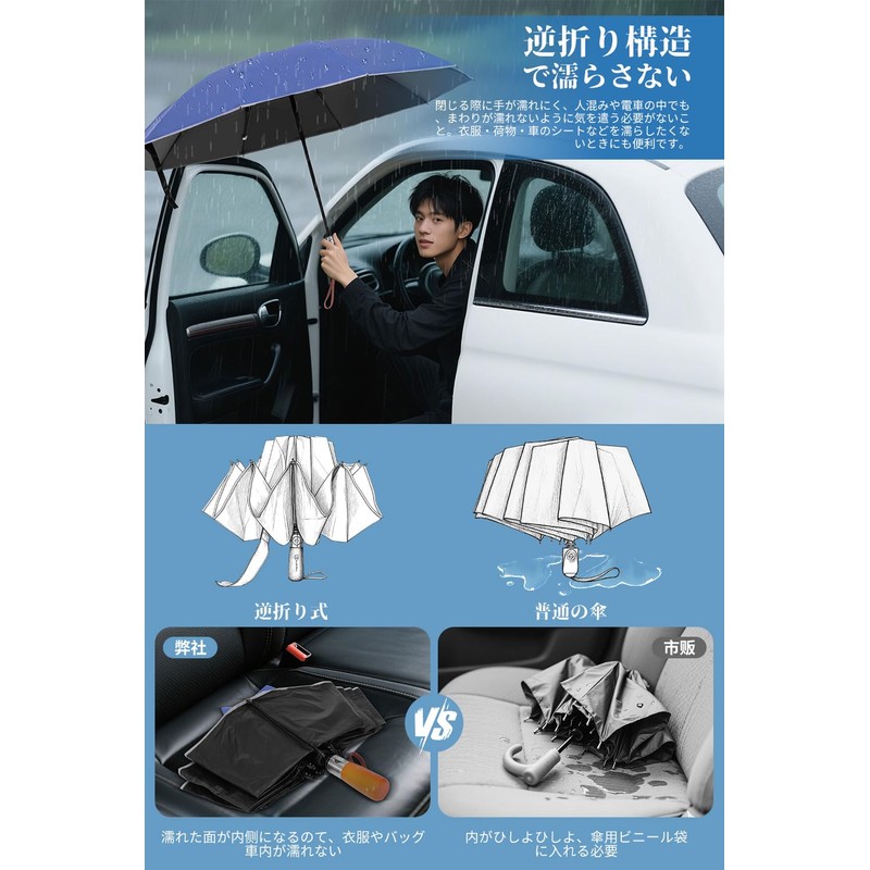 - Can be opened and closed with one hand. Reverse folding structure & open/close function with only one hand: This product can be opened and closed easily with a single button. It can be operated with one hand, so it is convenient when you have a lot of luggage or when you get in or out of a car. In addition, the inverted structure keeps the wet side of the umbrella folded inward when closed, keeping the outside dry and free from worrying about getting wet in your clothes, bag or car. The tip of the umbrella can be placed upward, so it is smooth to dry