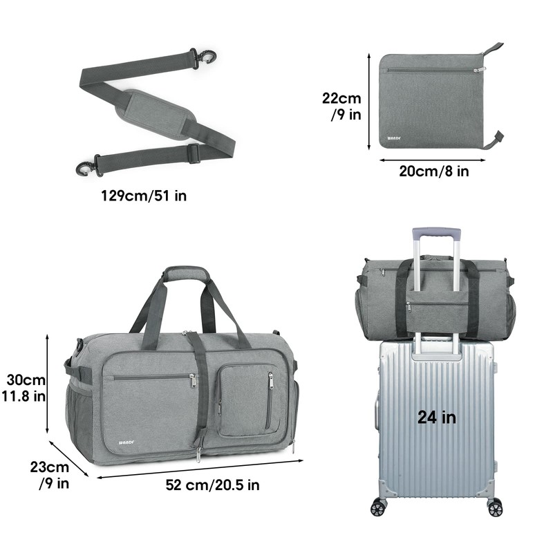 - CARRY-ON SIZE WEEKENDER: The WANDF weekender bag measures 52*30*23 cm, fitting perfectly in the overhead bin. With a roomy 40L space, it can easily accommodate 1-3 days of daily essentials. The folded size is 22*20 cm, making it suitable as a just-in-case bag in your suitcase.