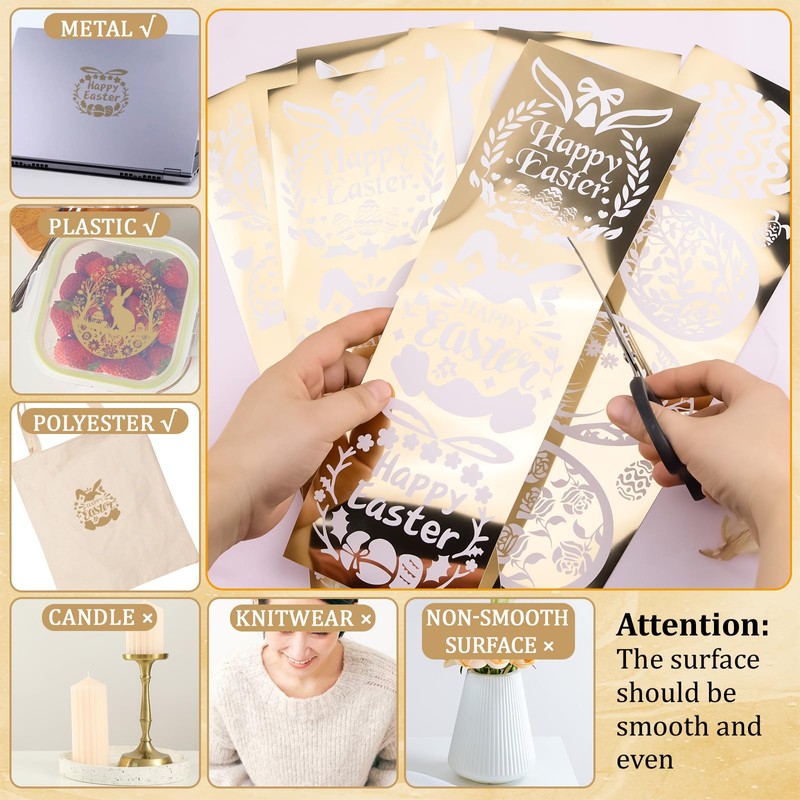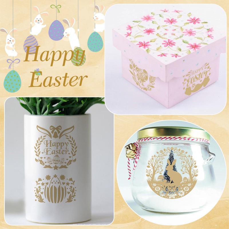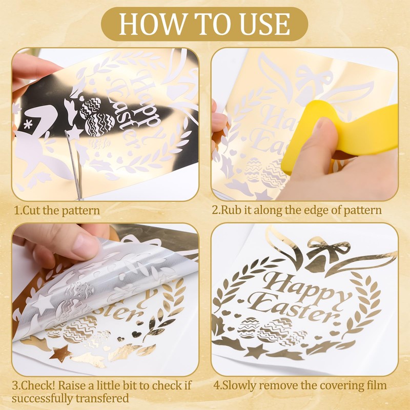 - Package Include: 8 sheets gold stamping Easter rub on transfer stickers. Size: 10*30cm