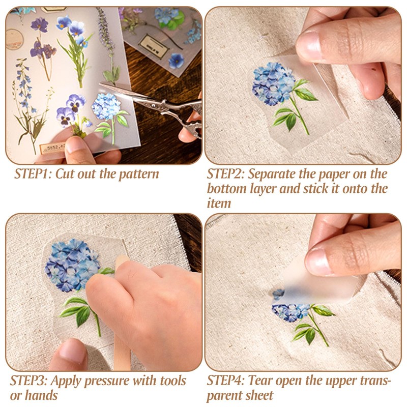 Transfer Sticker -- Unlike traditional stickers, our botanical themed stickers can be transferred. You just need to stick the pattern onto the item and rub it with an ice cream stick to successfully transfer the sticker onto the item.