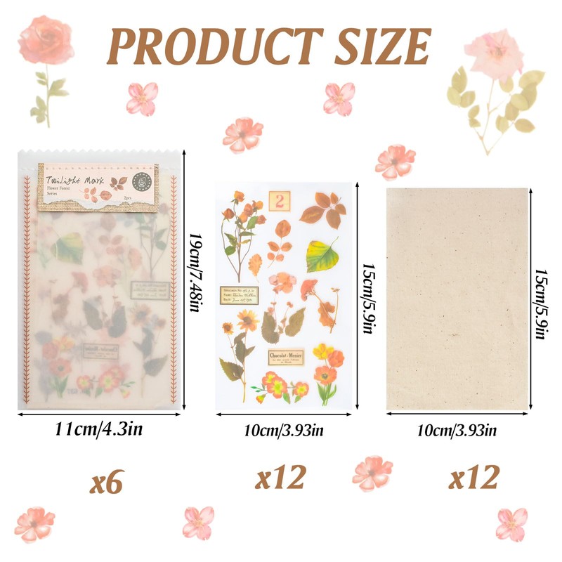 Package Include -- You can receive 6 packs of vintage flower stickers, each with 2 sheets stickers and 2 sheets of cottons, there are approximately 14 pcs vintage stickers per sheet. The envelope bag is about 7.48*4.3inch, and the cotton linen is about 5.9*3.93inch.