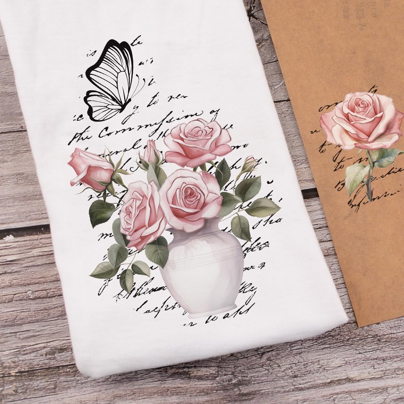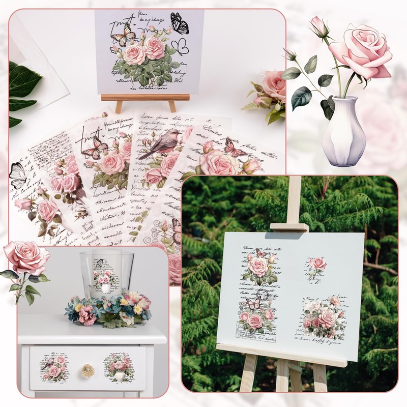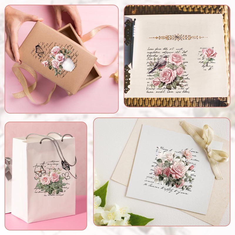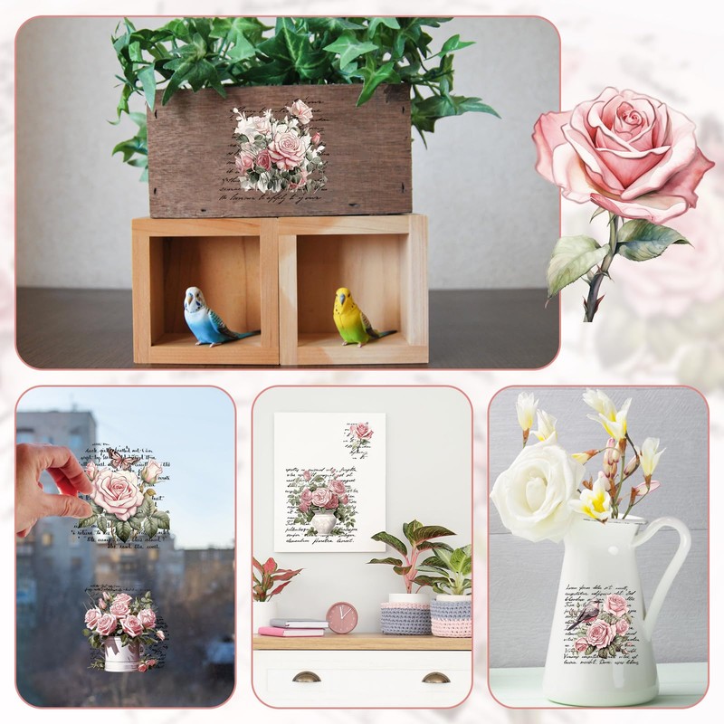 WANDIC Retro Rub On Stickers, 6 Sheets Pink Retro Flower Decals, Rose Stickers with Letters, Waterproof Decals for DIY Scrapbooking