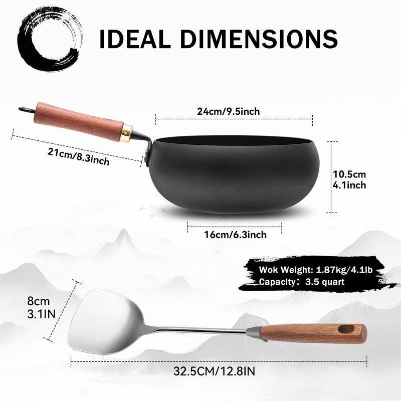 - Specs & Care Dia. 9.5 in (24 cm); depth 4.1 in (10.5 cm); base 6.3 in (16 cm); handle 8.3 in (21 cm); wok ≈4.1 lb; lid ≈2 lb. Hand-wash only; after cooking, wash, dry completely, and wipe a thin oil film before storage. Avoid dishwasher/long soaking/oven or broiler (wooden handle).