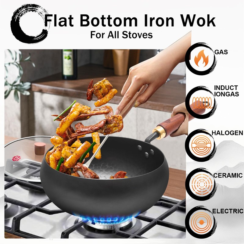 WANGYUANJI 9.5-Inch Iron Wok Pan with Lid & Spatula, Deep Flat-Bottom Stir Fry, Uncoated & Unseasoned, Induction Compatible, Upgraded Wooden Handle