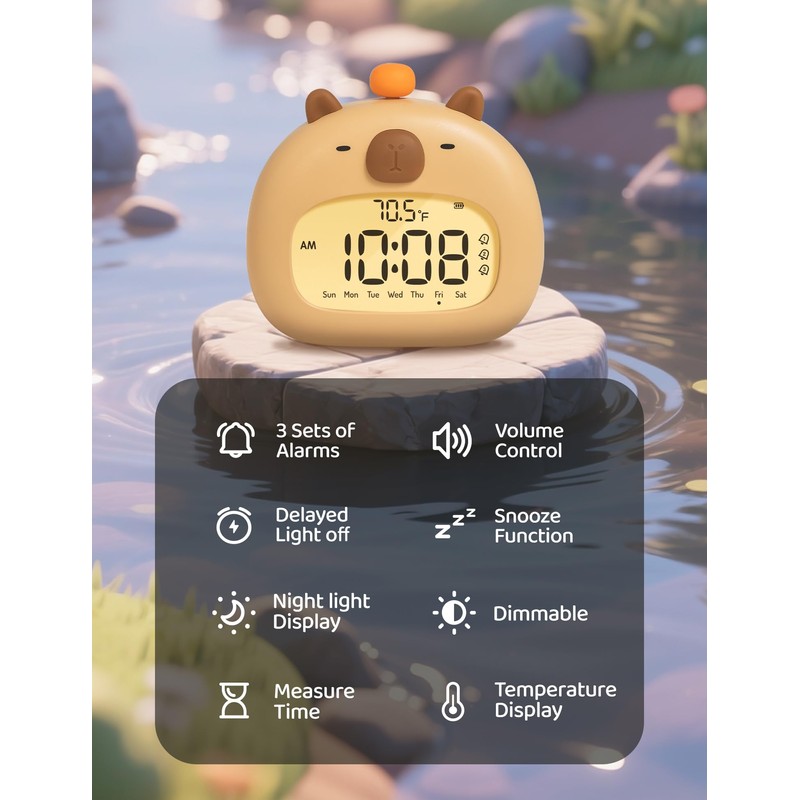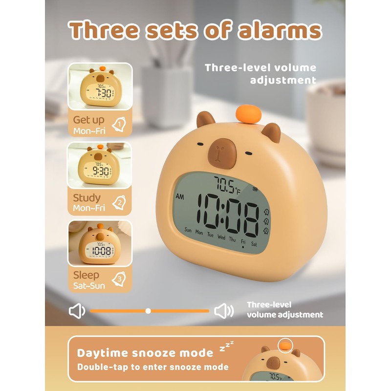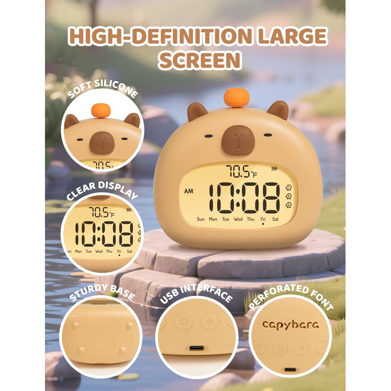 - The Best Gift For KidsCute Capybara alarm clock is the best gift for children back to school, intelligent function, not only can be used to decorate the room, but also can cultivate children's ability to sleep independently. The cute Capybara alarm clock is very popular with children and is a birthday and holiday gift for children, perfect for bedrooms, children's night lights, relaxation, outdoor camping.