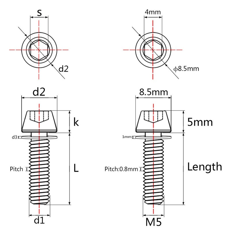 • Thread Pitch : 0.8mm;Head Size : 8.5 x 5mm/ 0.33" x 0.2" (D*H);Washer Size : 8.5 x 1mm/ 0.33" x 0.04" (D*Thickness)