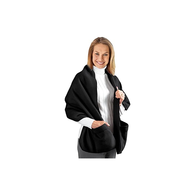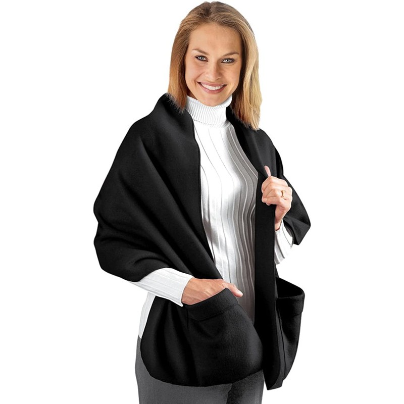 Warm and Cozy Fleece Wrap Shawl with Large Front Pockets - Black
