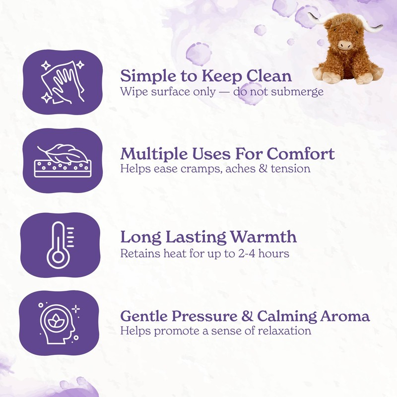 Warmies microwavable plush is a 2lb weighted stuffed Highland Cow animal toy designed to provide soothing warmth and calming comfort. Simply heat this microwave cuddly toy for gentle relief or chill in the freezer for cooling use. Lightly scented with French lavender and filled with flaxseed, it’s suitable as a toy heat pad, microwave hottie, hand warmer, or bedtime buddy. Suitable for kids, adults, and anyone seeking wellness and relaxation.