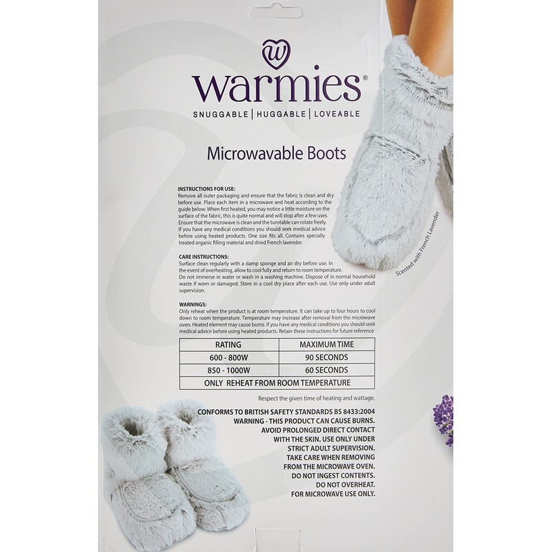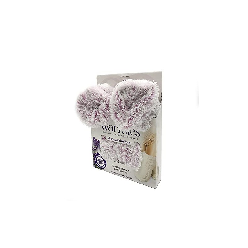 Product DescriptionSimply warm these luxurious Warmies fur boots in the microwave for the ultimate in comfort and relaxation. Warmies boots are made from the highest quality materials and gently scented with French lavender to help you relax. Quick and easy to use.IndicationsProvides soothing warmth for comfort and relaxationDirectionsTo use the Warmies Fully Heatable Wellness Luxury Boots, heat them in a microwave for 60 seconds if it's an 850-1000W microwave or up to 90 seconds if it's a 600-800W microwave. After heating, place the boots on your feet and enjoy the soothing warmth and relaxing aroma. For cooling relief, chill the boots in a freezer. Ensure the boots are regularly surface cleaned with a lightly damp cloth, allowing them to dry at room temperature. Do not immerse them in water. These boots are suitable for all ages.